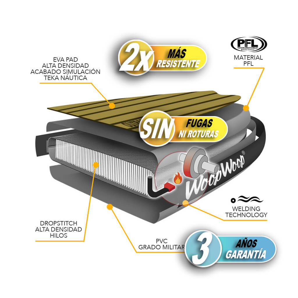 En nuestras Tablas Paddle Surf WoopWoop utilizamos la Fusión de los materiales por calor, mediante un proceso mecanizado se unen las juntas de los Railes de la PaddleSurf transformando las dos piezas en una sola, siendo mucho más resistente y extremadamente fuerte.Al usar el Welded Rail Technology evitamos las fugas de aire y le otorgamos mayor Durabilidad y Dureza a nuestras Tablas de paddle Surf Hinchable.